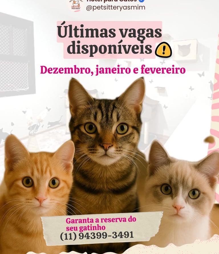 Maryas: Conta com 6,98 m² e acomoda até três gatinhos. R$140,00 baixa temporada ou R$160,00 em meses de alta procura, cobramos R$10,00 por cada gato extra, então se você tem dois fica R$150,00 ou R$170,00 a diária.